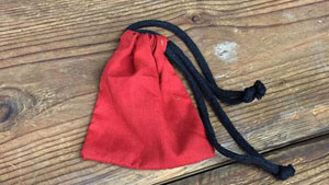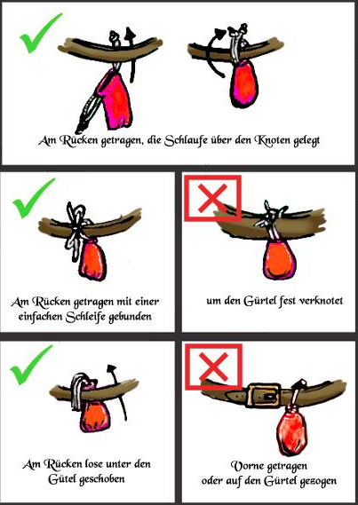 These are worn on a belt and represent money pouches / purses. These pouches are intended to simulate simple pickpocketing. The contents are varied and may be kept by the player. Please leave the note with the OT instructions in the bag. The empty pouches should be returned to the organizational HQ as soon as possible so that the next players can play with them again. Below you will find some hints on how to attach the pouch to your belt and the card to print it out yourself on cardboard. If you want to contribute to the pickpocketing game, you are welcome to make red pouches and contents and have them stolen by other players. Please assume that this is a donation to the game and you will not get them back. Thank you for giving your fellow players a nice game!